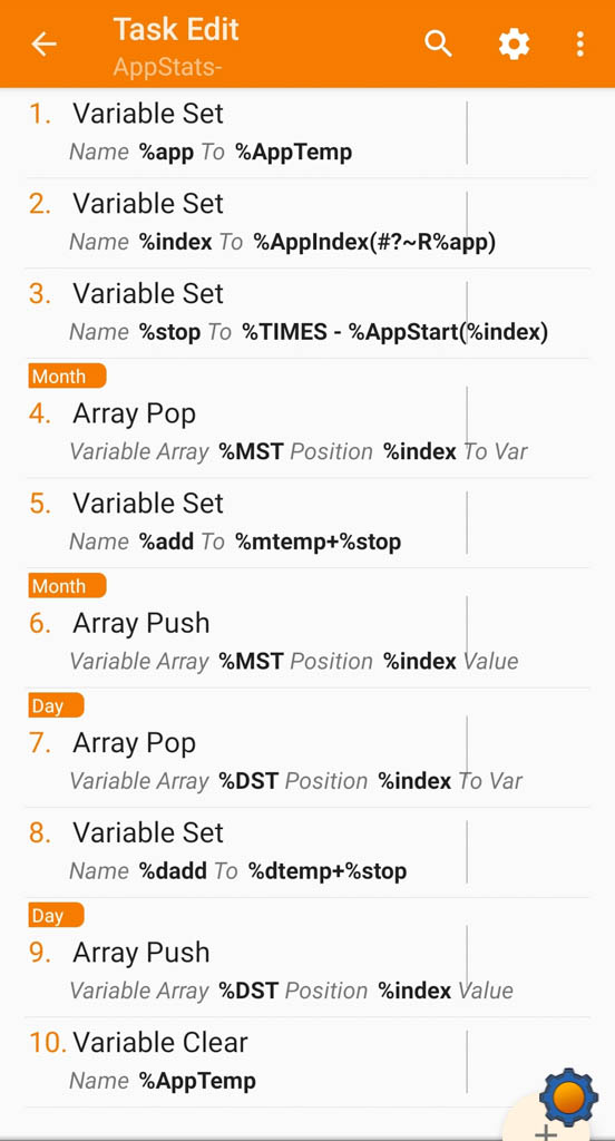 Profile: Monthly Reset Day: The 1st Enter: Clear Month Stats A1: Variable Clear [ Name:%MST* Pattern Matching:On Local Variables Only:Off ] A2: Variable Set [ Name:%count To:1 Recurse Variables:Off Do Maths:Off Append:Off Max Rounding Digits:3 ] A3: For [ Variable:%loop Items:%AppIndex() ] A4: Array Push [ Variable Array:%MST Position:%count Value:0 Fill Spaces:Off ] A5: Array Push [ Variable Array:%AppStart Position:%count Value:0 Fill Spaces:Off ] A6: Variable Add [ Name:%count Value:1 Wrap Around:0 ] A7: End For