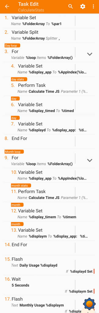 CalculateStats Abort Existing Task A1: Variable Set [ Name:%FolderArray To:%par1 Recurse Variables:Off Do Maths:Off Append:Off Max Rounding Digits:3 ] A2: Variable Split [ Name:%FolderArray Splitter:, Delete Base:On ]A3: For [ Variable:%loop Items:%FolderArray() ] A4: Variable Set [ Name:%display_app To:%AppIndex(%loop) Recurse Variables:Off Do Maths:Off Append:Off Max Rounding Digits:3 ] A5: Perform Task [ Name:Calculate Time JS Priority:%priority Parameter 1 (%par1):%DST(%loop) Parameter 2 (%par2): Return Value Variable:%timed Stop:Off ] A6: Variable Set [ Name:%display_timed To:%timed Recurse Variables:Off Do Maths:Off Append:Off Max Rounding Digits:3 ] A7: Variable Set [ Name:%displayd To:%display_app: %timed Recurse Variables:Off Do Maths:Off Append:On Max Rounding Digits:3 ] A8: End For A9: For [ Variable:%loop Items:%FolderArray() ] A10: Variable Set [ Name:%display_app To:%AppIndex(%loop) Recurse Variables:Off Do Maths:Off Append:Off Max Rounding Digits:3 ] A11: Perform Task [ Name:Calculate Time JS Priority:%priority Parameter 1 (%par1):%MST(%loop) Parameter 2 (%par2): Return Value Variable:%timem Stop:Off ] A12: Variable Set [ Name:%display_timem To:%timem Recurse Variables:Off Do Maths:Off Append:Off Max Rounding Digits:3 ] A13: Variable Set [ Name:%displaym To:%display_app: %timem Recurse Variables:Off Do Maths:Off Append:On Max Rounding Digits:3 ] A14: End For A15: Flash [ Text:Daily Usage %displayd Long:On ] If [ %displayd Set ] A16: Wait [ MS:0 Seconds:5 Minutes:0 Hours:0 Days:0 ] If [ %displaym Set ] A17: Flash [ Text:Monthly Usage %displaym Long:On ] If [ %displaym Set ]