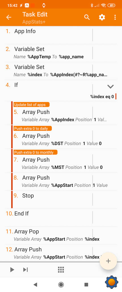Profile: App Stats Application: Facebook, Twitter, Instagram... Enter: AppStats+ A1: App Info [ Package: Ignore Packages: Ignore Unlaunchable Apps:Off Get All Details:Off ] A2: Variable Set [ Name:%AppTemp To:%app_name Recurse Variables:Off Do Maths:Off Append:Off Max Rounding Digits:3 ] A3: Variable Set [ Name:%index To:%AppIndex(#?~R%app_name) Recurse Variables:Off Do Maths:Off Append:Off Max Rounding Digits:3 ] A4: If [ %index eq 0 ]A5: Array Push [ Variable Array:%AppIndex Position:1 Value:%app_name Fill Spaces:Off ] A6: Array Push [ Variable Array:%DST Position:1 Value:0 Fill Spaces:Off ] A7: Array Push [ Variable Array:%MST Position:1 Value:0 Fill Spaces:Off ] A8: Array Push [ Variable Array:%AppStart Position:1 Value:%TIMES Fill Spaces:Off ] A9: Stop [ With Error:Off Task: ] A10: End If A11: Array Pop [ Variable Array:%AppStart Position:%index To Var: ] A12: Array Push [ Variable Array:%AppStart Position:%index Value:%TIMES Fill Spaces:Off ] Exit: AppStats- A1: Variable Set [ Name:%app To:%AppTemp Recurse Variables:Off Do Maths:Off Append:Off Max Rounding Digits:3 ] A2: Variable Set [ Name:%index To:%AppIndex(#?~R%app) Recurse Variables:Off Do Maths:Off Append:Off Max Rounding Digits:3 ] A3: Variable Set [ Name:%stop To:%TIMES - %AppStart(%index) Recurse Variables:Off Do Maths:On Append:Off Max Rounding Digits:1 ] A4: Array Pop [ Variable Array:%MST Position:%index To Var:%mtemp ] A5: Variable Set [ Name:%add To:%mtemp+%stop Recurse Variables:Off Do Maths:On Append:Off Max Rounding Digits:3 ] A6: Array Push [ Variable Array:%MST Position:%index Value:%add Fill Spaces:Off ] A7: Array Pop [ Variable Array:%DST Position:%index To Var:%dtemp ] A8: Variable Set [ Name:%dadd To:%dtemp+%stop Recurse Variables:Off Do Maths:On Append:Off Max Rounding Digits:3 ] A9: Array Push [ Variable Array:%DST Position:%index Value:%dadd Fill Spaces:Off ] A10: Variable Clear [ Name:%AppTemp Pattern Matching:Off Local Variables Only:Off ]